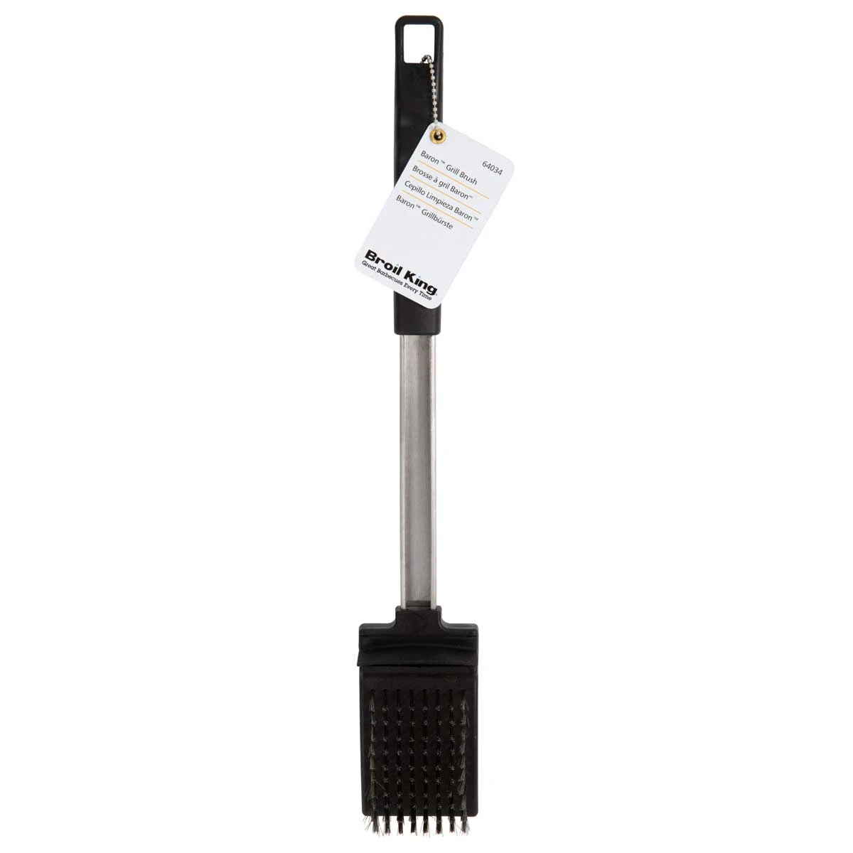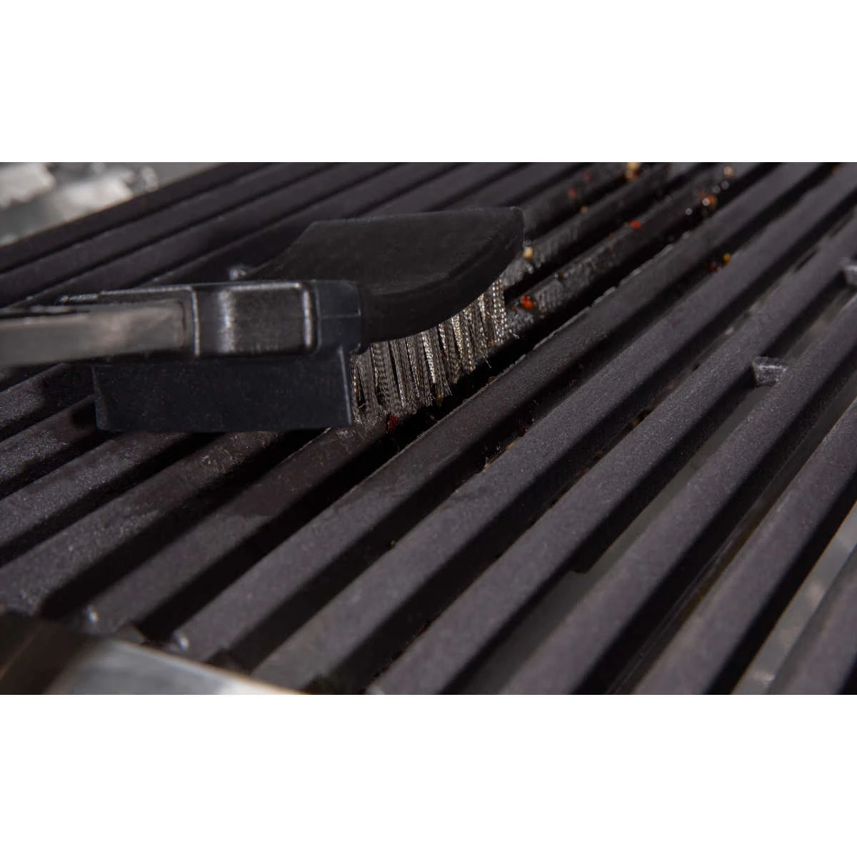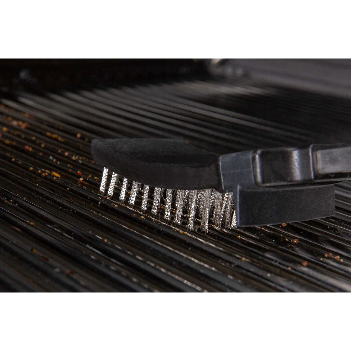 Diese aus Edelstahl gefertigte Grillbürste mit Kunststoffgriff und Spritzschutz eignet sich für jeden Grillrost.