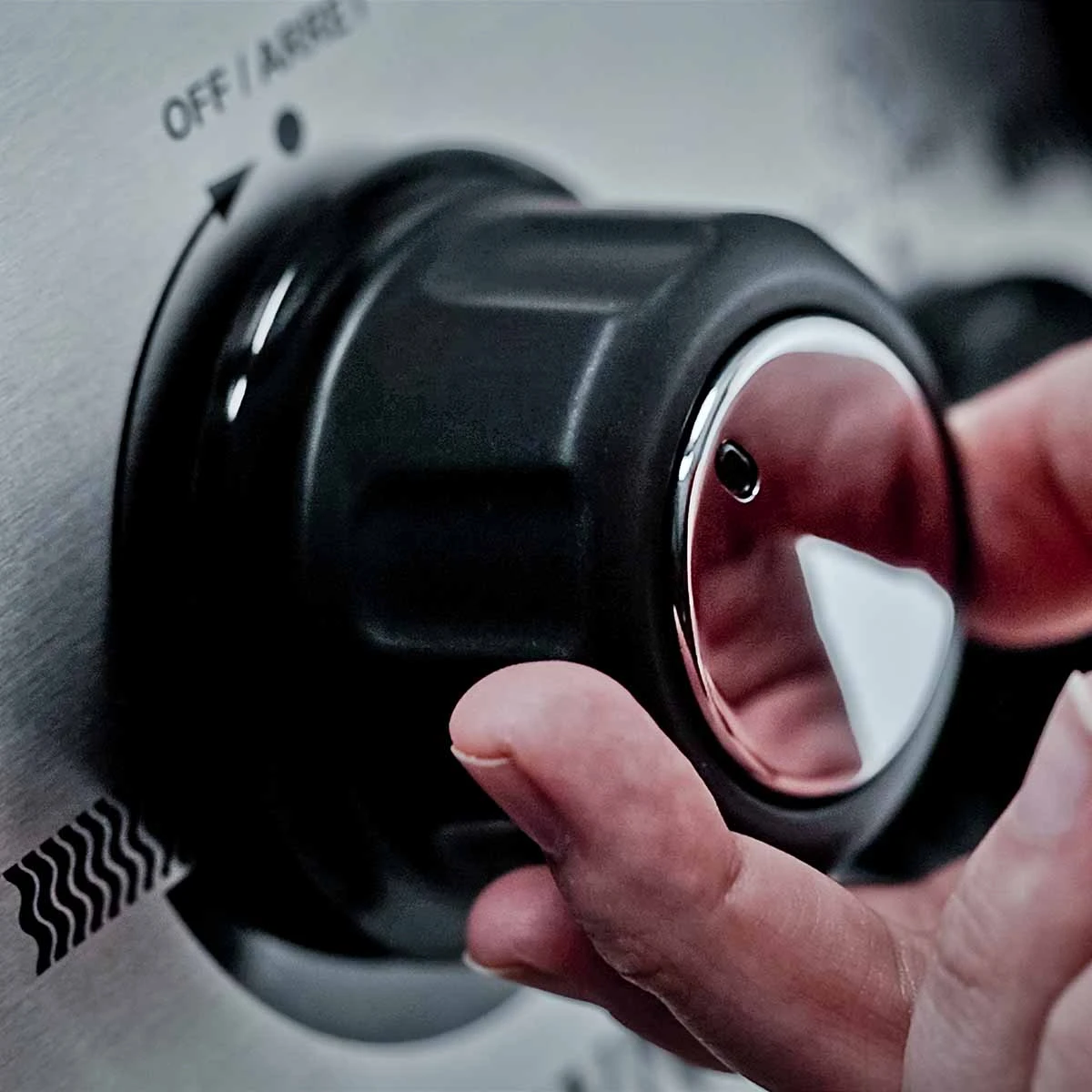 Die große Grillfläche von 65 x 44 cm ist mit 4 Flav-R-Cast matt-emaillierten Gussrosten ausgestattet und über ihr ist ein emaillierter Ablagerost montiert, mit dem Ihr super indirekt garen oder Speisen warm halten könnt. Typisch für Broil King sind auch das Flav-R-Wave Verdampfungssystem aus Edelstahl sowie die Linear Flow Gasdüsen mit 180° Sensi Touch Steuerung und Sure Lite Elektrozündung. Ebenso sind sämtliche Griffe, das Bedienteil und die Seitenablagen aus Edelstahl gefertigt.