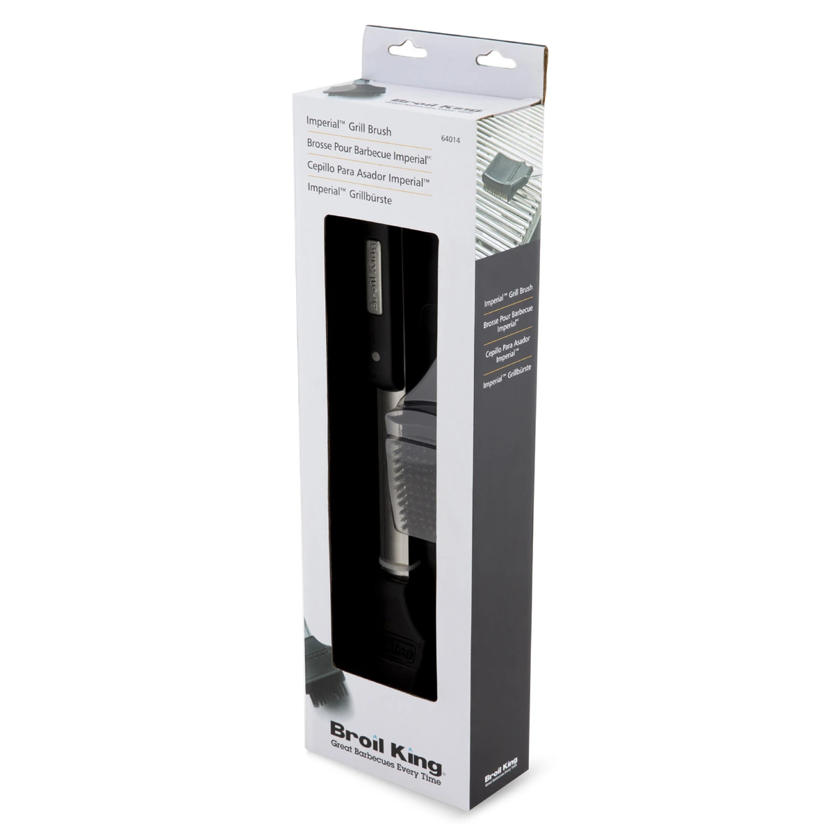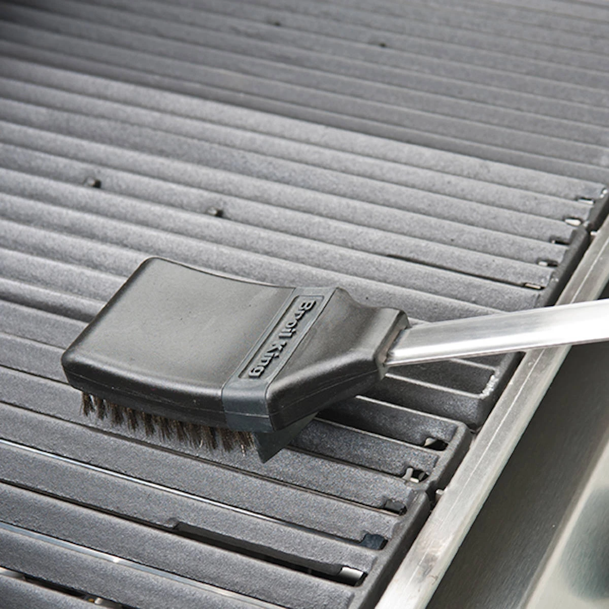 Die aus Edelstahl gefertigte Grillbürste von Broil King bietet einen innovativ geformten Bürstenkopf, um die natürliche Bürstbewegung bestmöglich zu unterstützen. Der integrierte Spritzschutz sorgt dafür, dass beim Abbürsten Ihrer Grillroste kein Schmutz in Ihre Richtung geschleudert wird.