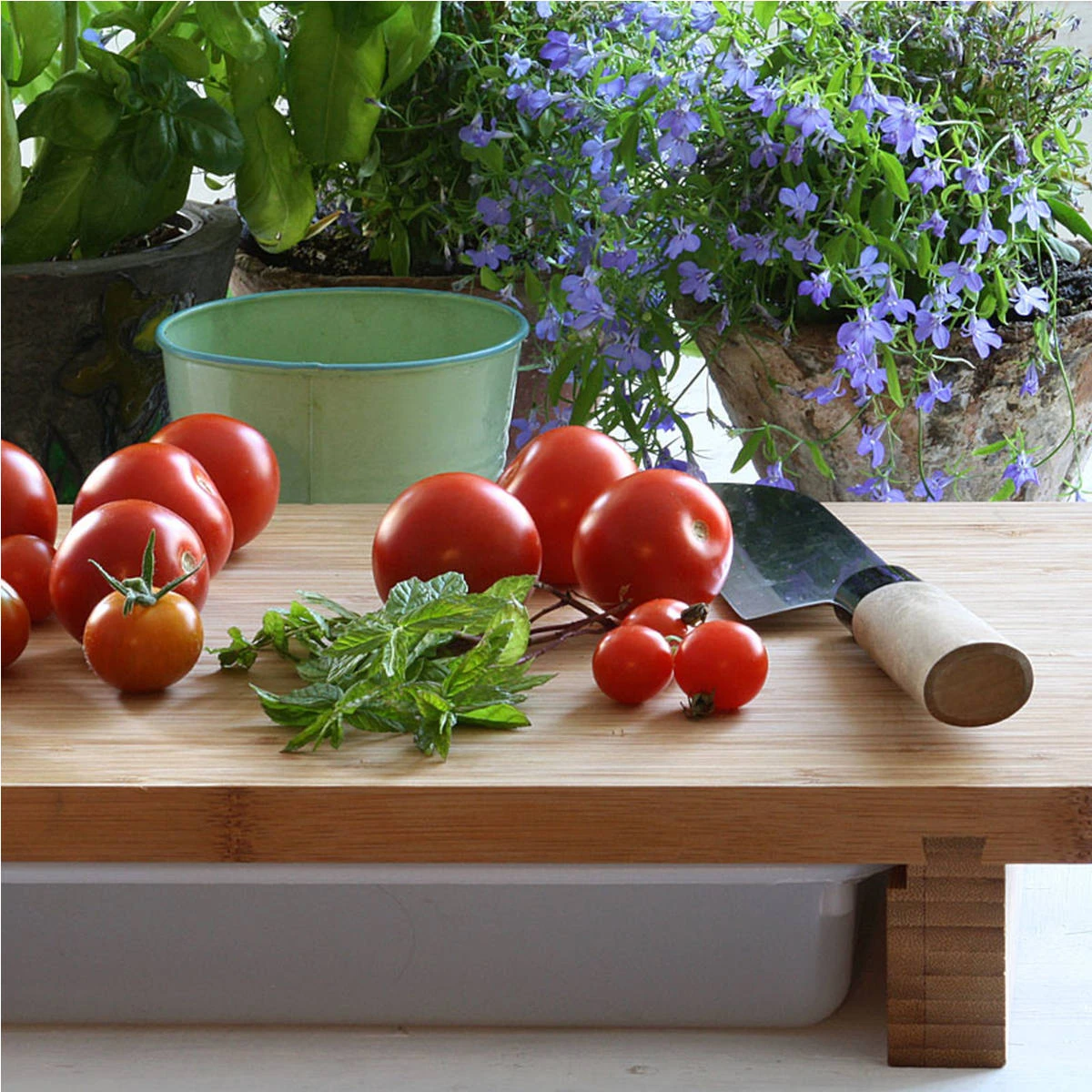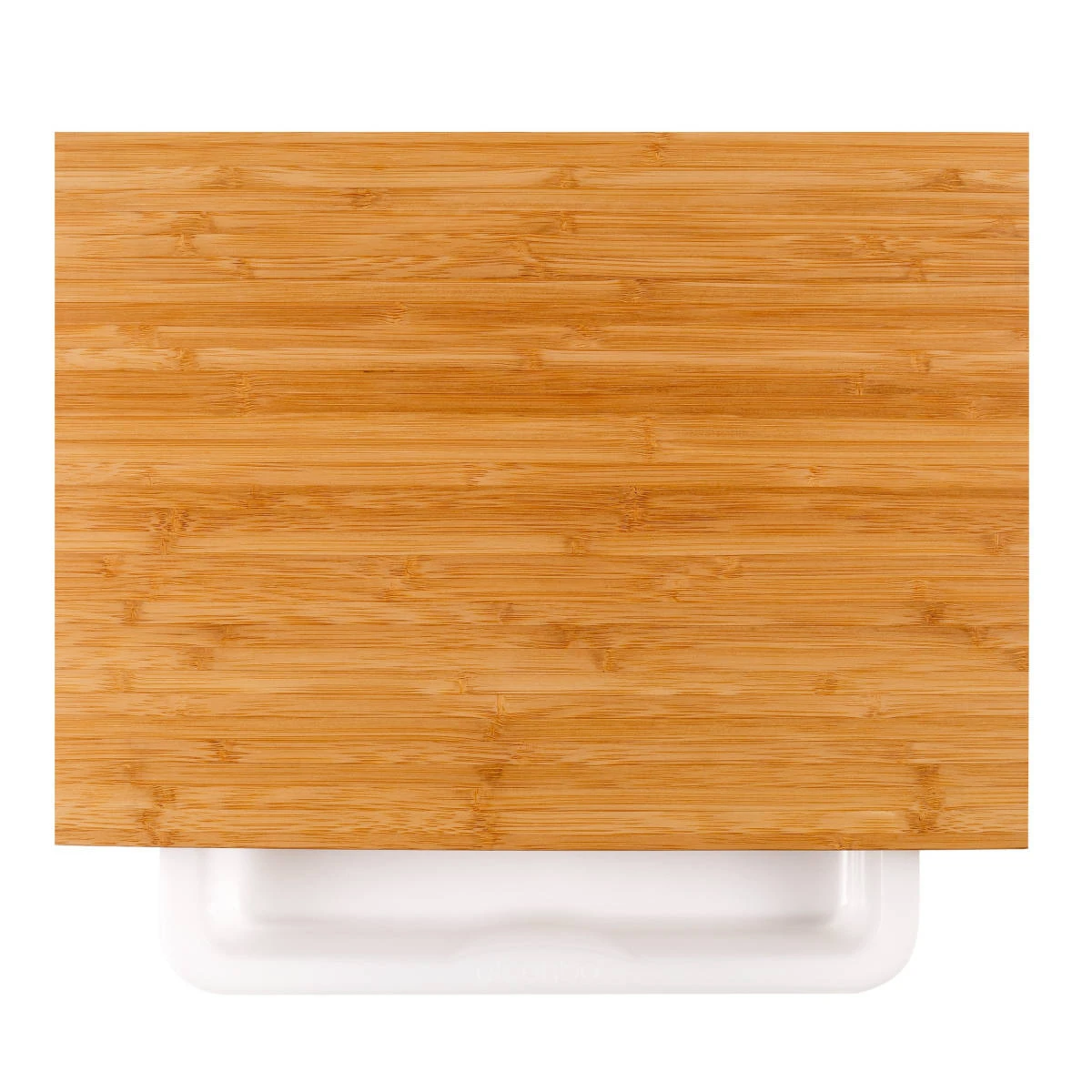 Das Schneidebrett besteht aus geschichtetem , was für eine edle Optik sorgt und gleichzeitig robuste Stabilität und langanhaltende Freude an diesem funktionellen Küchenhelfer garantiert. Zudem ist Bambus ein ausgesprochen nachhaltiges Material – das ist regenerativ und ökologisch. Die wird leichtgängig wie eine Schublade nach hinten und vorne herausgeschoben. Schält Obst und Gemüse, schneidet Euer Brot oder zerlegt Geflügel auf dem massiven Bambus-Holzbrett, das Euch eine mit einer Größe von bietet. Alle Abfälle und Brotkrümel schiebt Ihr einfach in die Auffangwanne und schon sind sie aus dem Weg. Die Auffangwanne aus Kunststoff ist für die Spülmaschine geeignet.
