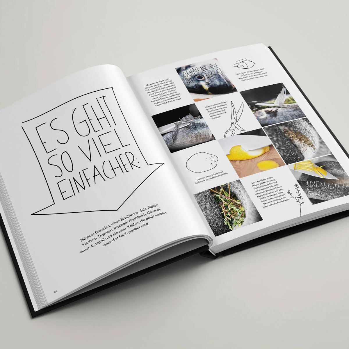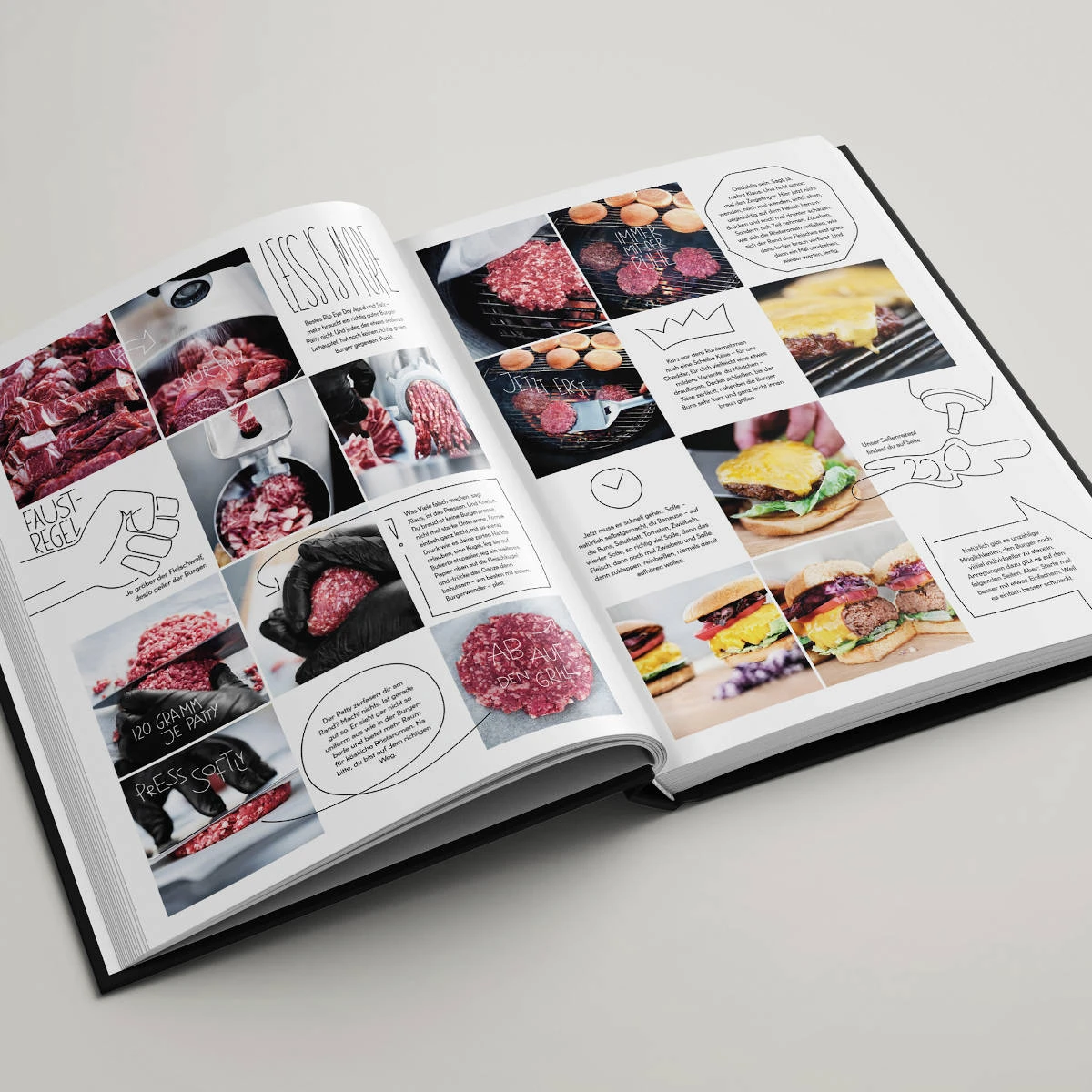 Mit Schritt für Schritt-Anleitungen, garniert mit Illustrationen, abgeschmeckt mit Strichzeichnungen und einem Schuss Humor. Mit Fotos, die Lust aufs Nachgrillen der Rezepte machen, und Texten, die den Appetit auf ein gutes Stück Fleisch, einen ordentlichen Burger oder süßen, gegrillten Nachtisch anheizen.