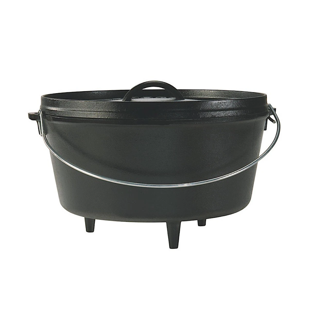 Aufgrund des besonderen Designs hat der Topf ein Fassungsvermögen von fast 10 Litern. Und durch die drei Füße könnt Ihr den LODGE Camp Dutch Oven Topf auch direkt in der Glut einsetzen. Durch den Henkel einfach in der Handhabung, sorgt das Gusseisen nicht nur für die hervorragenden Gareigenschaften, es macht den Dutch Oven Topf robust und langlebig.