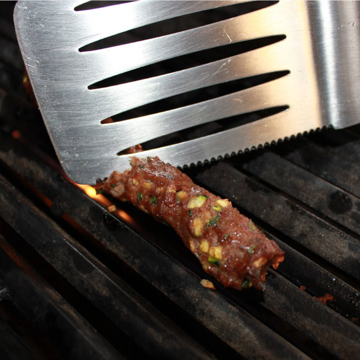 - Der ist mit seinem breiten Spatel das perfekte Werkzeug, um Burger, Fisch, Spiegelei und Grillkäse zu wenden und zu servieren. Die seitliche Zahnung erlaubt schnelles Schneiden und Zerteilen von nicht zu hartem Grillgut. Mit Gummierung im Griff und Aufhängeöse.