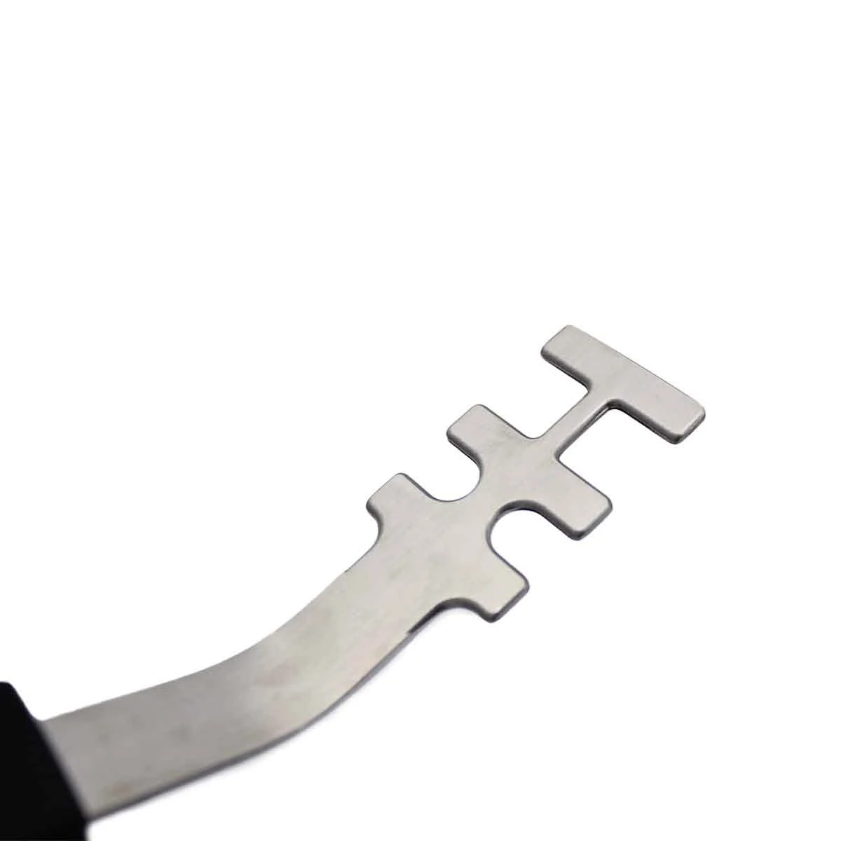 Der Grillrost-Heber von SANTOS besteht aus Edelstahl und einem Griff aus Kunststoff. Durch die ergonomische Form und den rutschsicheren Griff liegt er optimal in der Hand. Der Hebel des Hebers hat Einkerbungen für runde und eckige Roste, somit können ver