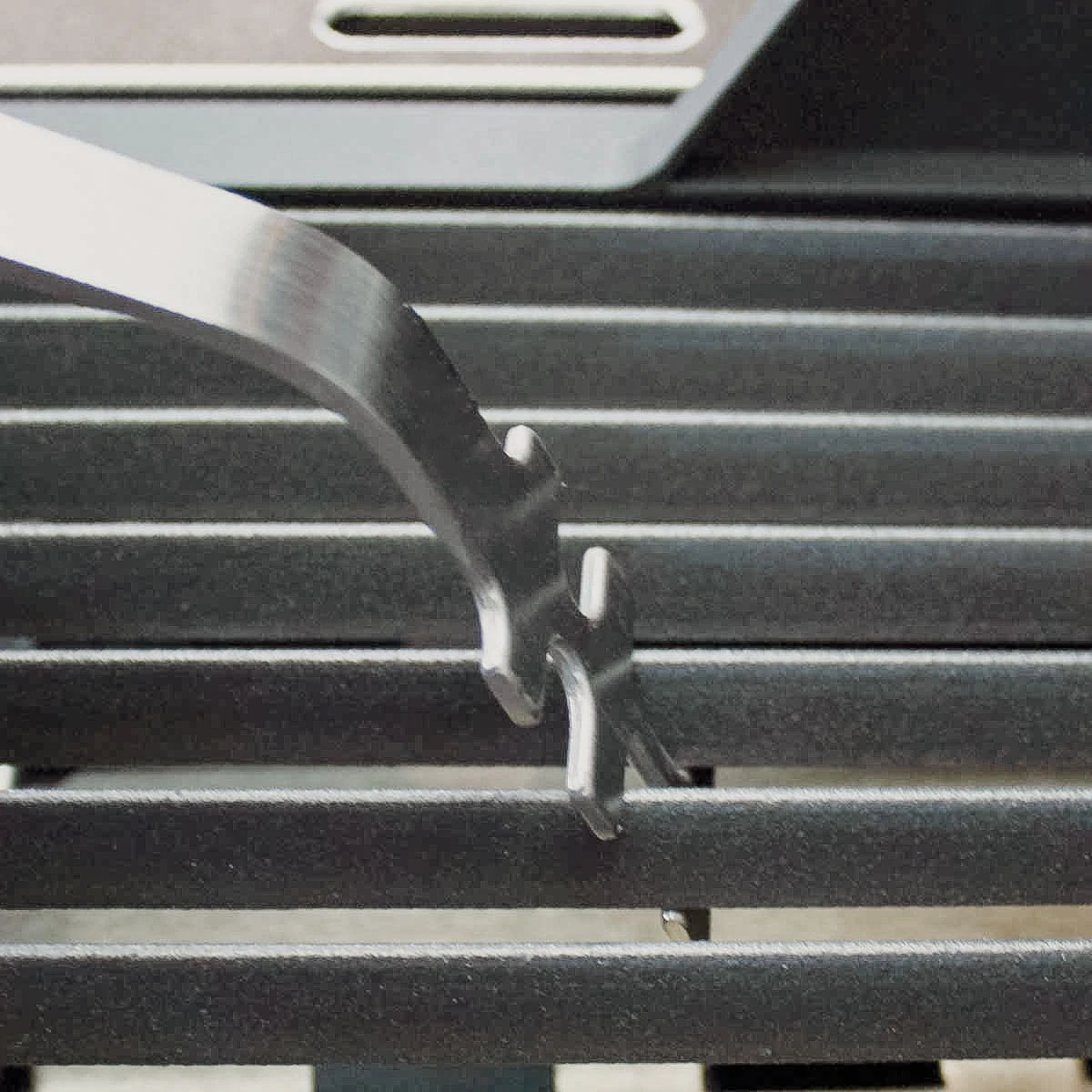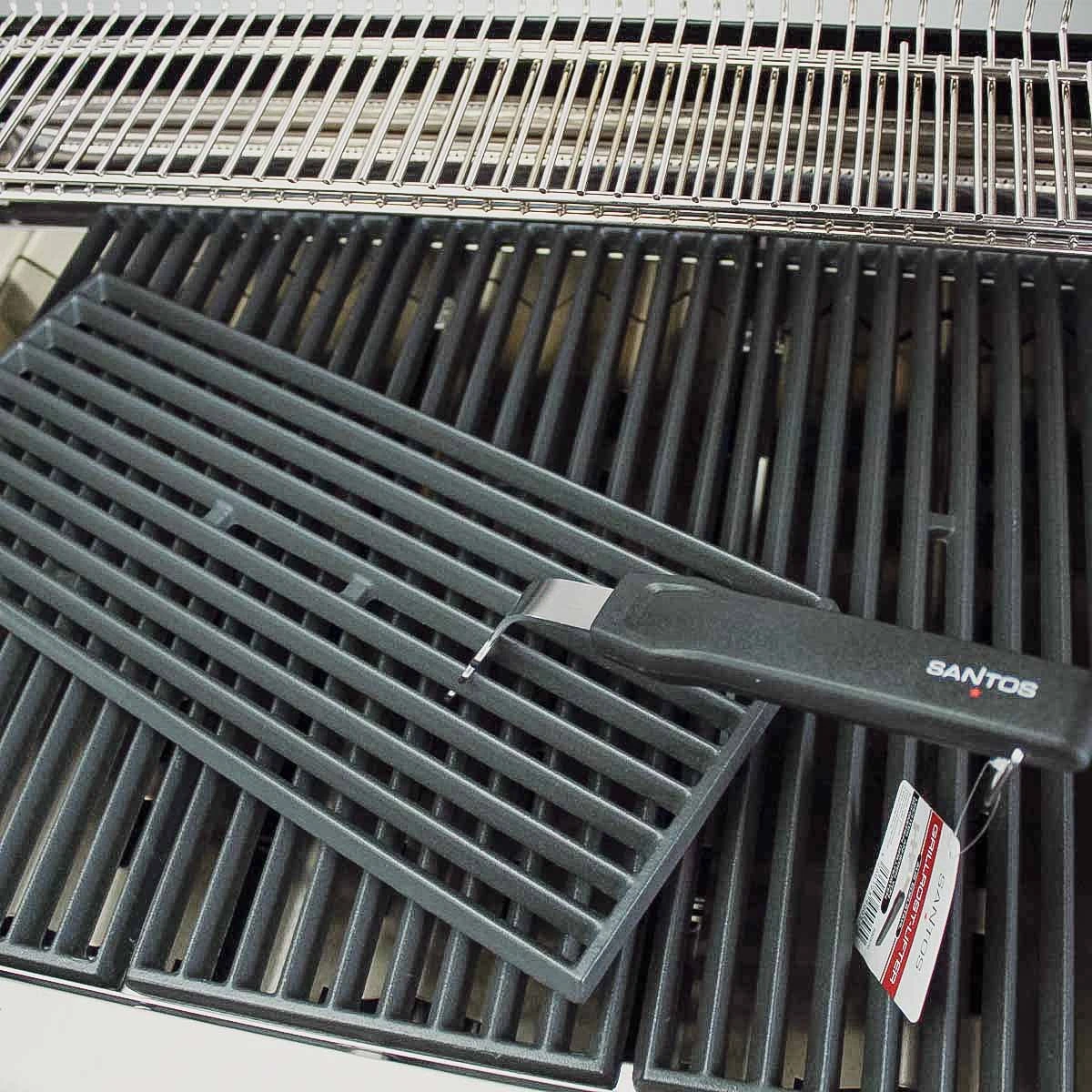 Mit dem SANTOS Grillrost-Heber bewegt Ihr sicher und mühelos den heißen Rost vom Grill, ohne Euch die Finger zu verbrennen. Damit könnt Ihr z. B. schnell eine Smokerbox unter den Rost legen, den Grillrost höhenverstellen oder bei unterschiedlichen Grillseiten wenden. Ebenso hebt Ihr ganz einfach die Roste zum Reinigen nach dem Grillen aus dem Grill heraus und die Hände bleiben dabei sauber.