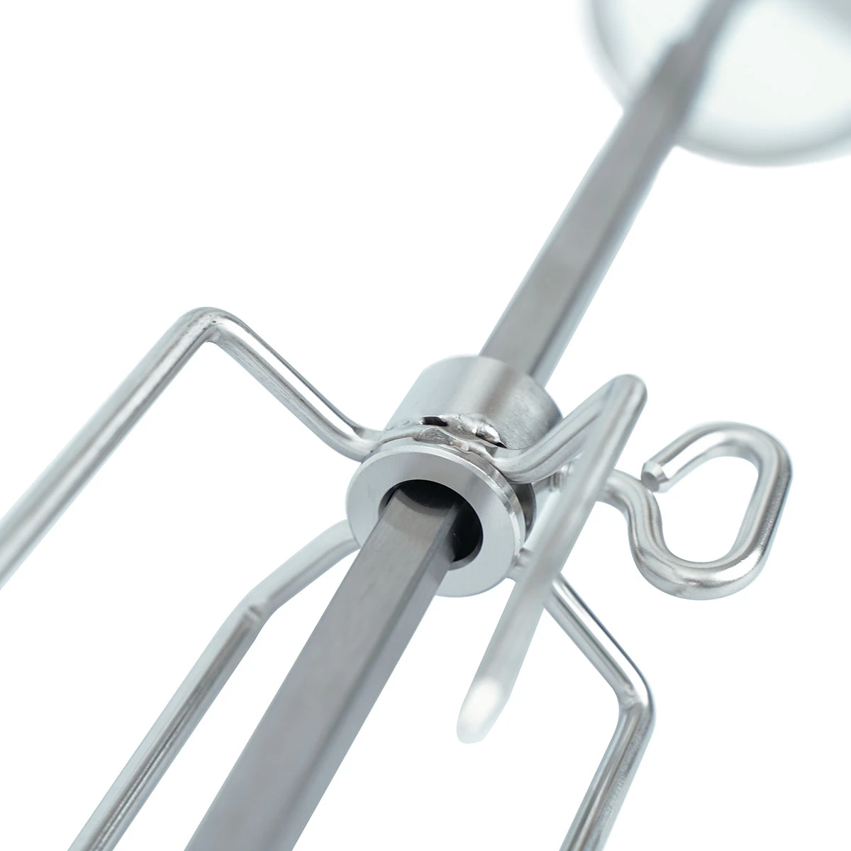 Drehspieß einlegen – fertig: Mit der von SANTOS entwickelten ist die Handhabung der Rotisserie maximal komfortabel. Sie hält den Spießstab aus magnetischem Edelstahl fest in der Halterung der Motoreinheit, sodass keine weitere Fixierung notwendig ist.