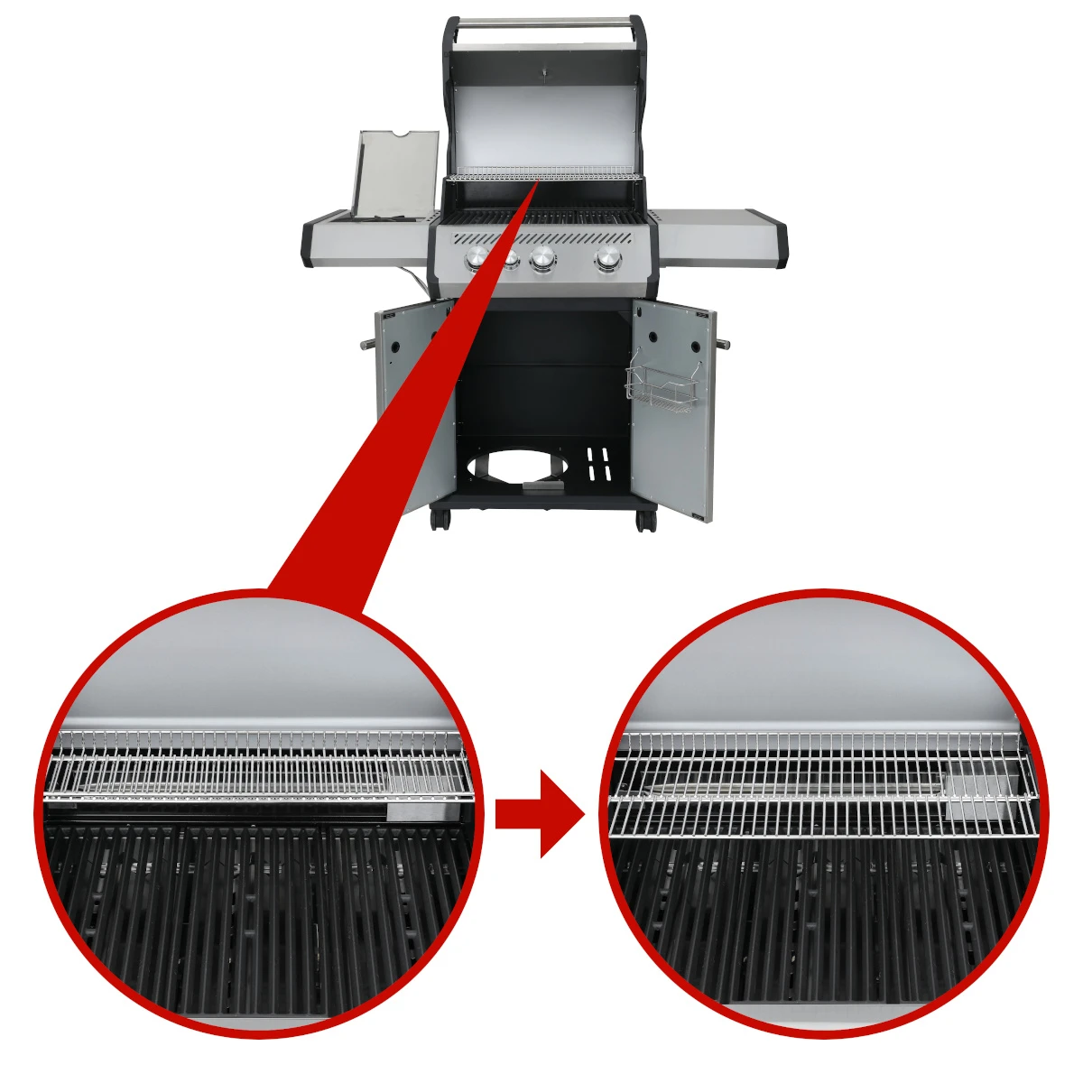 Der Warmhalterost ist ausziehbar, wodurch sich die Fläche im Handumdrehen fast verdoppelt. Das Warmhalterost lässt sich von ca. 14 cm auf ca. 24 cm in der Tiefe ausziehen. Darauf findet jede Menge Grillgut Platz. Ebenso lassen sich Würstchen oder sogar ein ganzes Roastbeef auf dem großzügigem Warmhalterost indirekt garen.