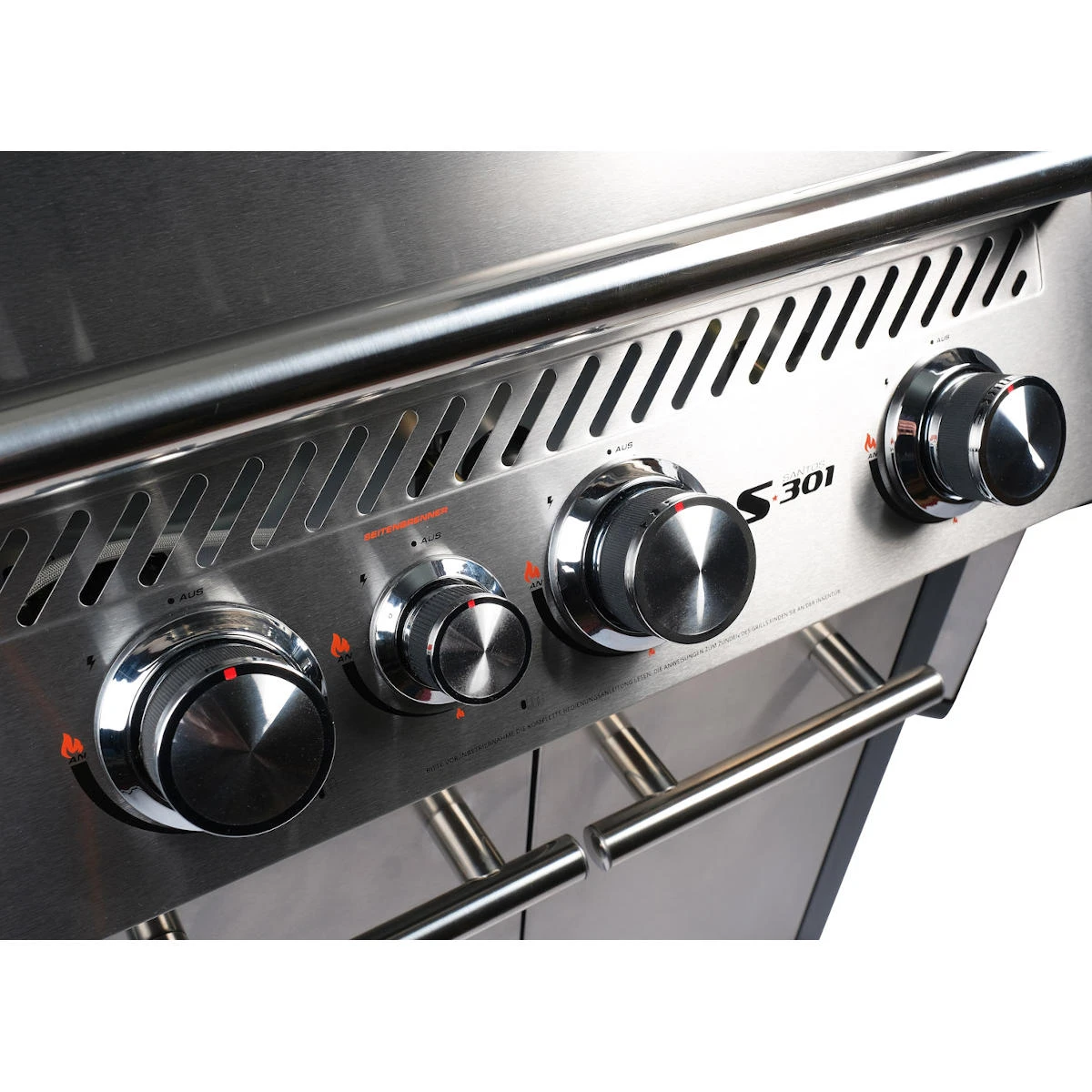 In der linken Ablage des Grills ist ein Seitenkocher integriert. Der Seitenkocher hat ein Kochfeld, auf dem Ihr mühelos Beilagen zubereiten könnt. Den Wok oder die Grillpfanne heizt Ihr mit satten 4 kW ein. Damit wird aus dem S 301 eine kleine Außenküche, mit der sich umfangreiche Menüs grillen und kochen lassen.