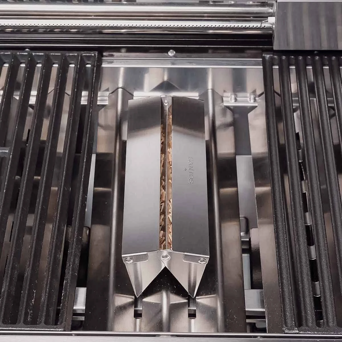 Die SANTOS Smokerbox ist universell für jeden Gasgrill einsetzbar, da der V-förmige Boden im Winkel verstellbar ist. So individuell angepasst lässt sie sich auf die verschiedenen Flammverteiler aufsetzen. Eine Mindestlänge von 25 cm ist erforderlich. Ebenso solltet Ihr den Abstand zwischen Flammenverteiler und Grillrost beachten. Je nach Gasgrill, müsst Ihr beim Benutzen der Smokerbox auf ein Grillrost verzichten.