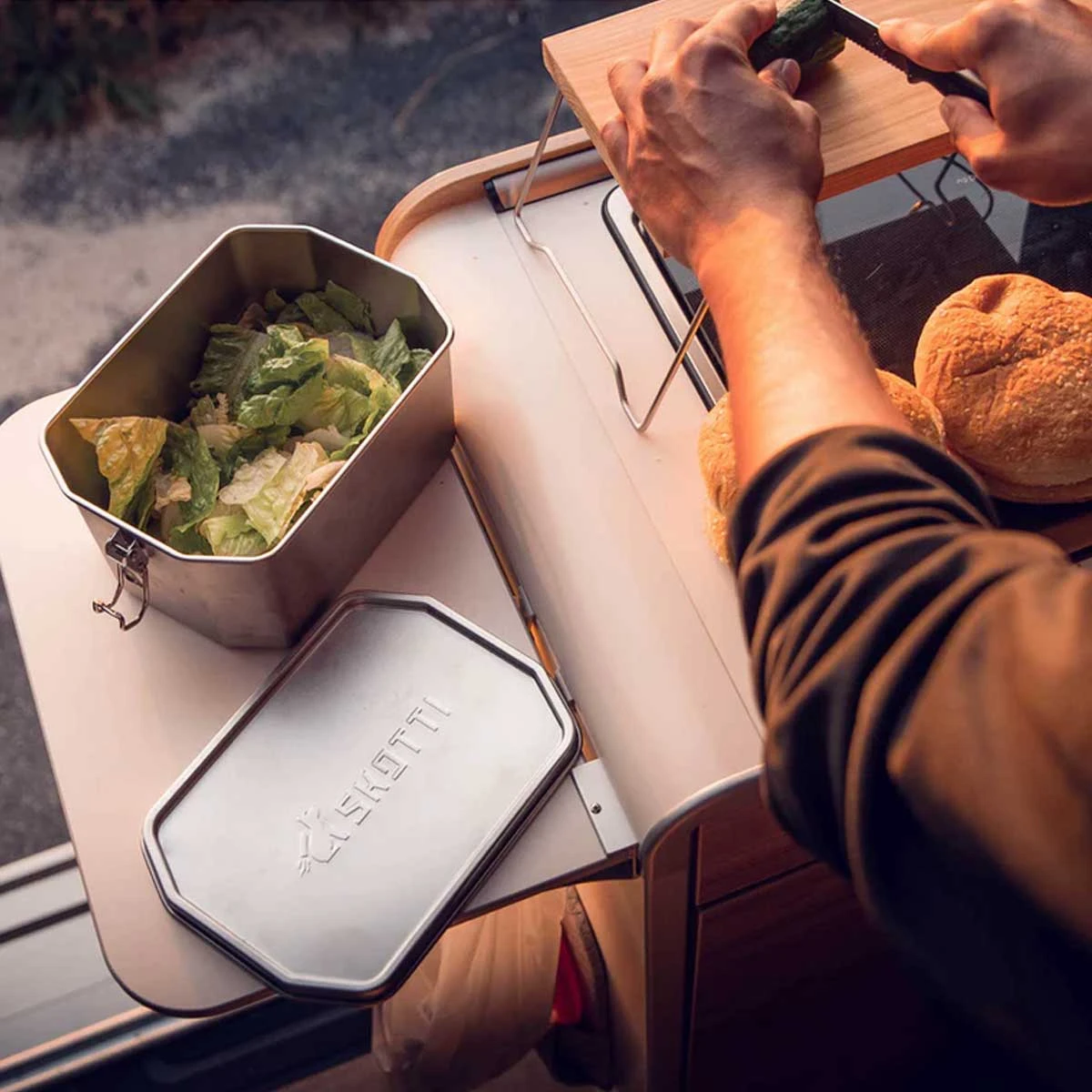 - : In der Box mit Silikondichtung und stabilen Verschlussklemmen könnt Ihr flüssige und feste Speisen problemlos transportieren. Nudelsalat, Grillfleisch, Erbsensuppe oder Reste vom BBQ – die Skotti Boks hält absolut dicht und ist eine tolle Alternative zu herkömmlichen Transportdosen aus Kunststoff.