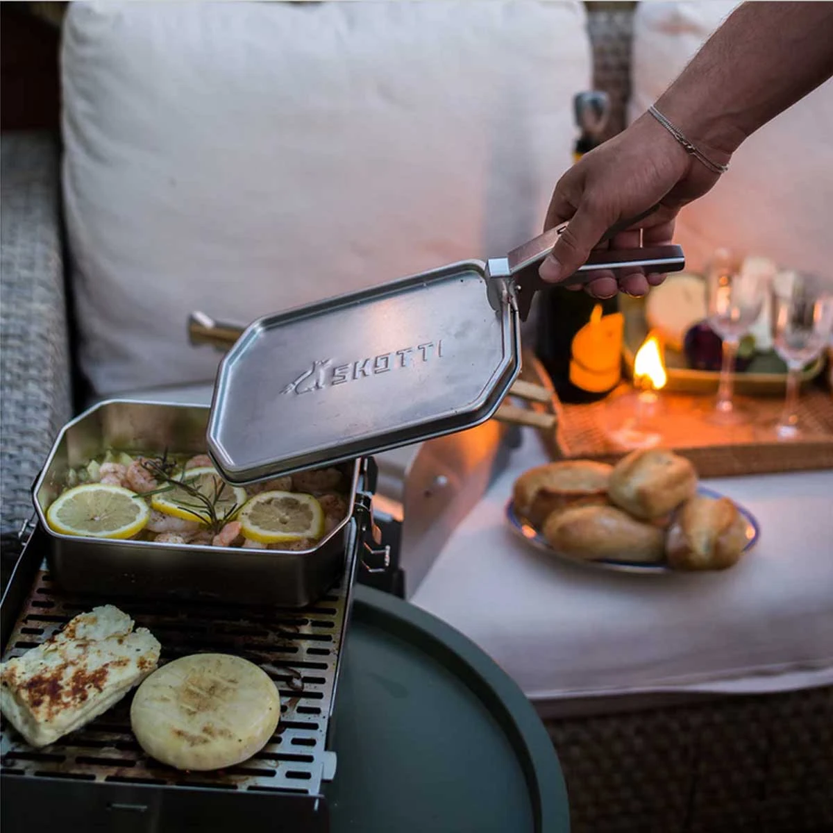 - : Wasser kochen, Eintopf zubereiten, Suppe aufwärmen, Nudeln oder Kartoffeln kochen ist mit der Skotti Boks auch in der Wildnis leicht gemacht. Wenn Ihr den Deckel auf dem Skotti verwenden wollt, entfernt Ihr zuerst die Silikondichtung. Auf dem Grillrost ist die Skotti Boks ein echtes Raumwunder und braucht nur die Hälfte der Skotti Grillfläche, so dass Ihr auf der anderen Seite noch ganz bequem Fleisch und Gemüse grillen könnt.
