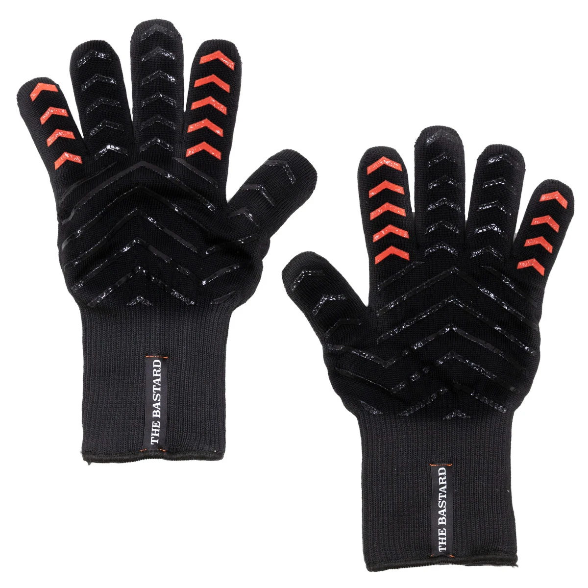 Die BBQ Handschuhe von The Bastard bieten Euch effizienten Schutz beim Hantieren am heißen Grill. Das sehr hitzeresistente Gewebe besteht aus den Fasern Nomex und Kevlar, die z.B. auch bei Feuerwehr- und Motorrad-Schutzkleidung bewährte Anwendung finden. Es ist äußerst stabil, reißfest und langlebig. Dank der Silikon-Grifffläche habt Ihr mit den Grillhandschuhen optimalen Halt für Grillbesteck, Dutch Oven, Grillrost und Co.